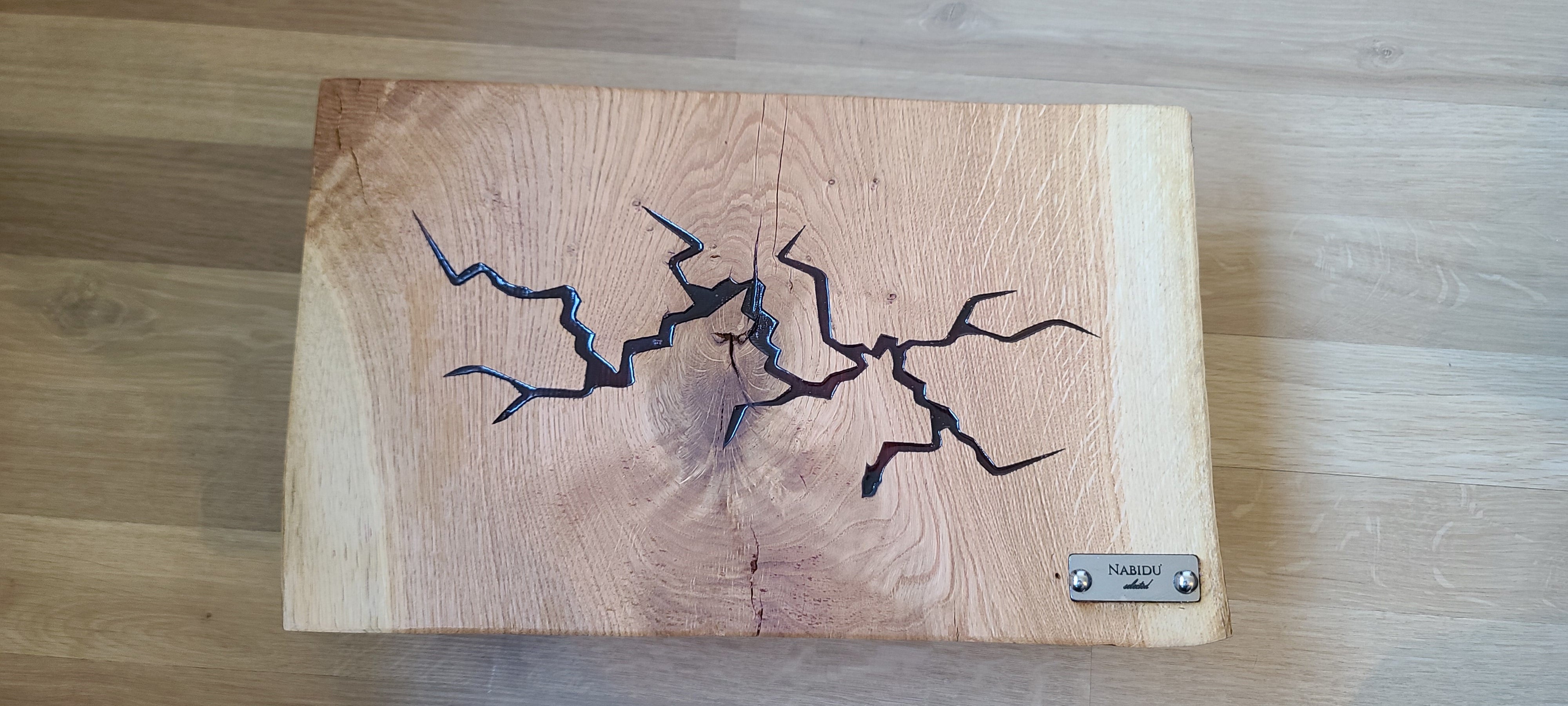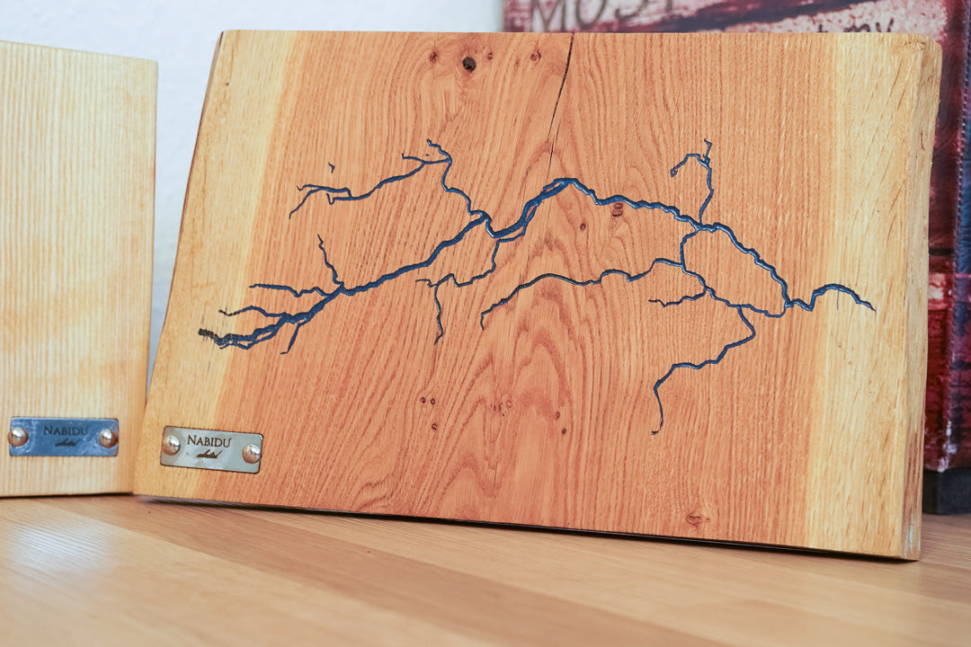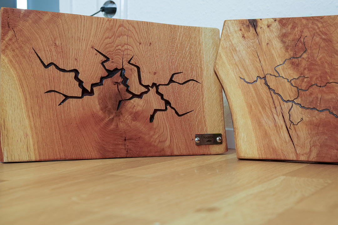 Jedes Modell ist ein echtes Einzelstück – mit natürlicher Holzmaserung, handgeschliffener Oberfläche und einer eingelassenen Gravur, die mit Epoxidharz ausgegossen wird.